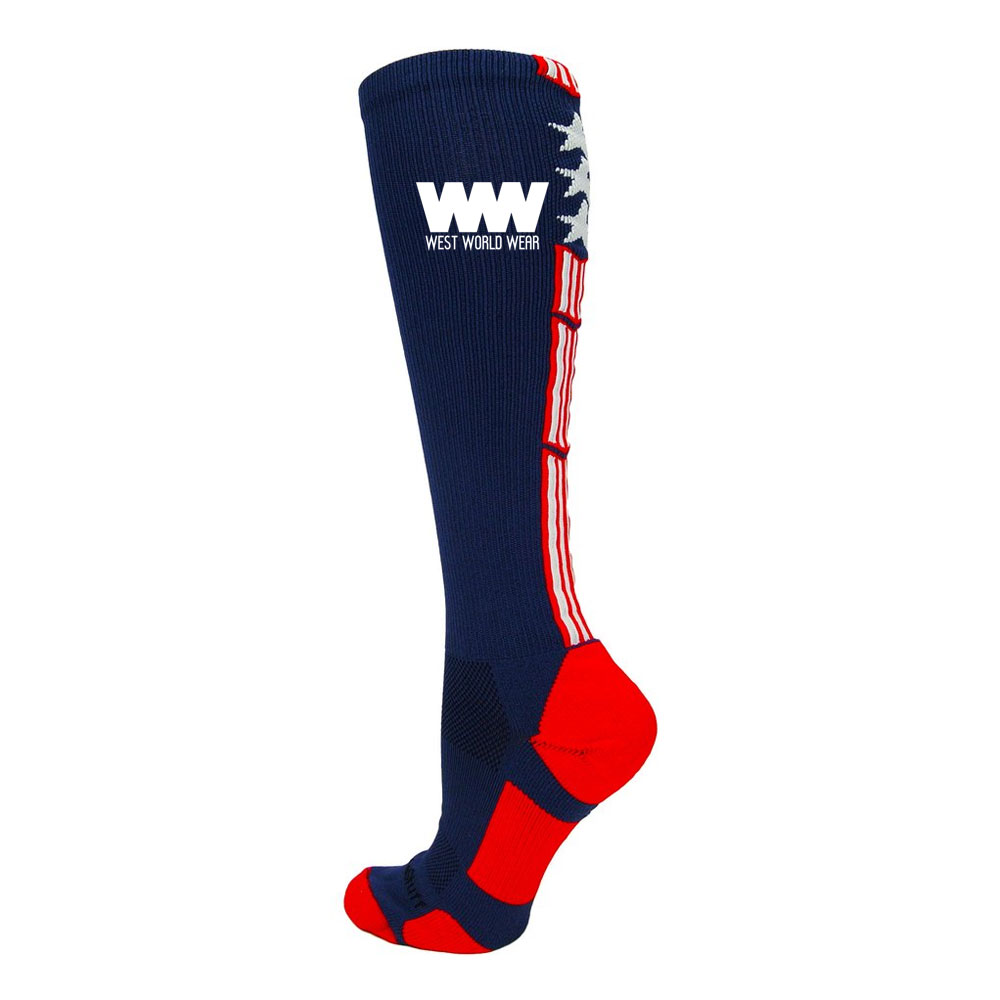 PERFECT AMERICAN FLAG SOCKS: Show your USA Pride in these over the calf American Flag socks featuring stars and stripes inspired by the American flag. American Flag socks Ideal for softball, baseball, lacrosse, basketball, field hockey, volleyball, wrestling, hockey, soccer, football, cheer, kickball and more!